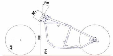 The next measurement needed is labeled as 'NH' on the diagram. This is the neck height measured from the lowermost rear edge of the lower bearing cup to the ground. When the frame is mocked-up in riding stance.